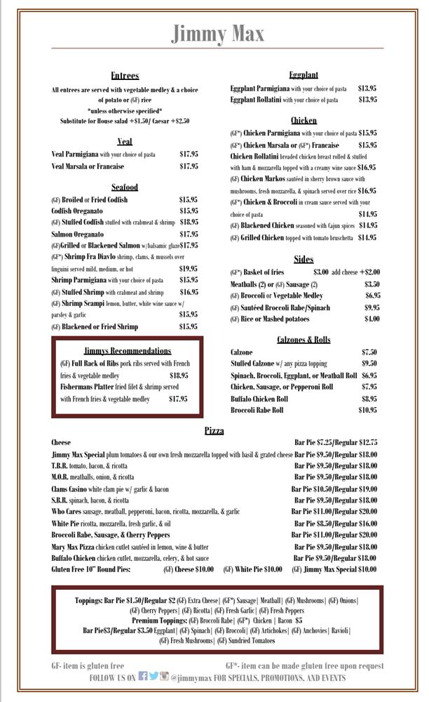 Welcome to Jimmy Max, a delightful representation of contemporary Italian dining located on Watchogue Rd in Staten Island. This gluten-free haven specializes in mouthwatering pizza that caters to diverse dietary needs, ensuring everyone can enjoy a slice of culinary bliss.